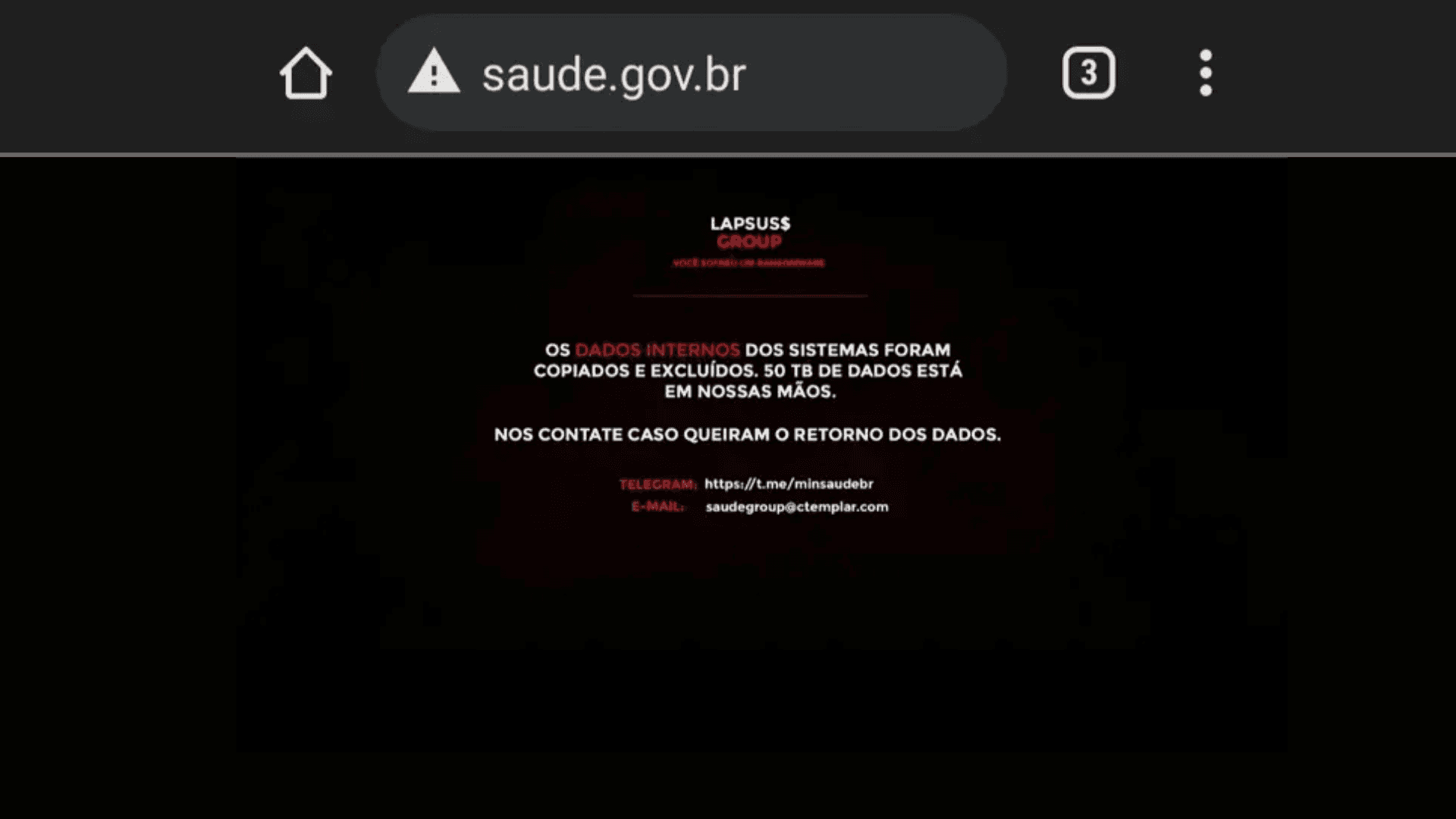 A primeira vez que registramos um ataque público do Lapsus$ foi em 10 de dezembro de 2021 — e eles foram atrás de peixe grande. A vítima foi o Ministério da Saúde do Brasil, que teve seus sistemas totalmente comprometidos e mais de 50 terabytes de dados exfiltrados e deletados. O ataque derrubou toda a base de dados de vacinação contra a COVID-19 e rolou às 1h da manhã. O site do Ministério foi deixado fora do ar com a mensagem: “Entre em contato conosco se quiser seus dados de volta”, acompanhada de contatos de Telegram e e-mail.